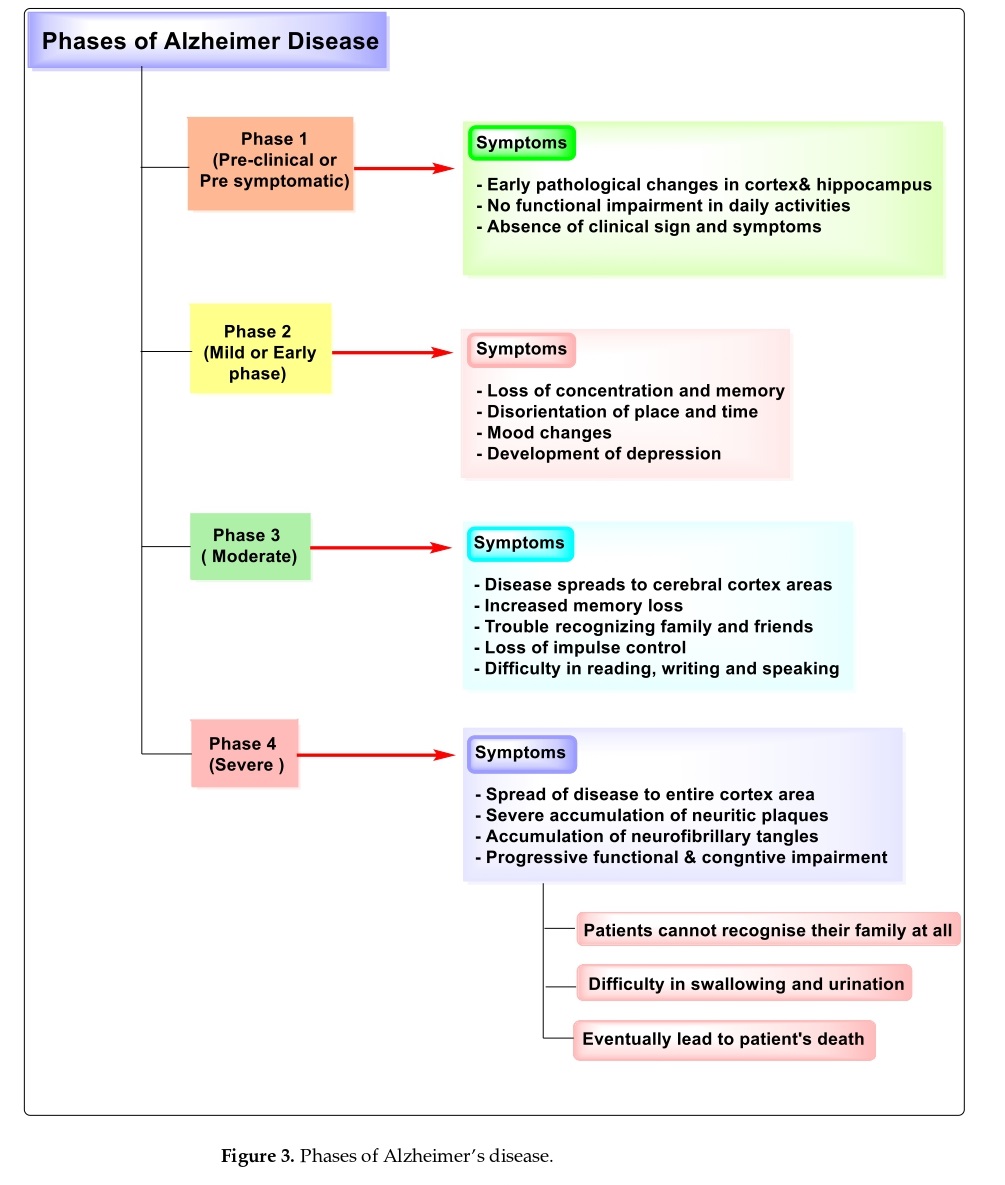 The mild or early stage involves loss of focus and memory, disorientation, mood swings, and depression. The moderate stage expands to a portion of the cerebral cortex causing memory loss, difficulty acknowledging people, impulse control loss, and difficulties in speaking, reading, and writing. The severe stage expands to the entire cortex leading to cognitive and functional impairment, an inability to recognize family members, and difficulties in urination and swallowing resulting in death.